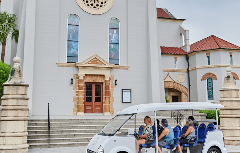 Please support small businesses and consider booking us directly, just use a web search to find us: Pineapple Ride and Tour ***Nights Of Lights Tours are available on our website ONLY*** Our Historical Tour is informative, comfortable, and convenient. Our expert tour guides will take the time to get to know you and share many stories about the oldest continuously occupied european settlement in the continental United States. Our tours are conducted on an electric vehicle with open sides and seat up to 10 People. This is an excellent way to see where everything is, and to learn Saint Augustine’s history in a fun and informative way. Three reasons to consider our tour: – FREE parking or get picked up anywhere downtown, Just call – We are pet friendly, all sizes and breeds welcome – This is THE MOST conveniently located and professional tour service available in Saint Augustine.